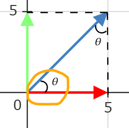 Para obtener el ángulo de nuestro vector cuando ya tengo las dos sombras (el componente y el componente ), usamos la tangente: